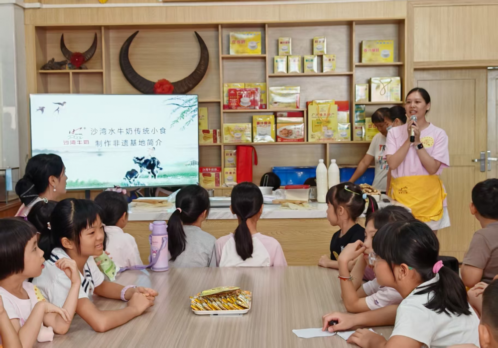 随后,沙湾水牛奶传统小吃制作技艺传承人苏玉琼女士,结合姜埋奶孝道故事,讲解制作流程、发展脉络,展示传统工具并分享创业创新故事,让孩子沉浸式感受非遗魅力。
