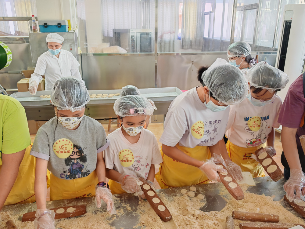 在师傅指导下,亲自体验牛奶白饼和姜埋奶制作。制作牛奶白饼时,孩子们互动研究传统饼模,力求压出图案清晰、内馅紧实的成品;姜埋奶制作中,孩子轮流磨姜汁、撞水牛奶,动手解锁非遗技艺。品尝香甜姜埋奶时,亲子情感在美食与文化中升温。最后,大家跟随苏玉琼女士走进现代化生产线,直观感受传统小吃从手工到标准化生产的蜕变。