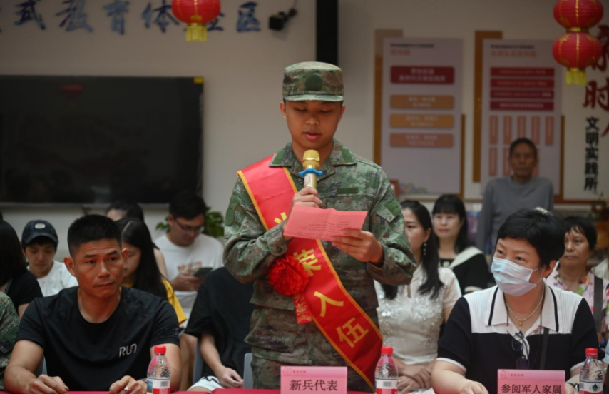家属代表的发言更是饱含深情。“孩子从小就向往军营,今天终于圆梦了!”应征青年叶铭浩母亲眼眶泛红,“我们会照顾好家里,让他在部队安心服役,争取立功受奖!”现场掌声雷动,鲜艳的光荣花映衬着青年们坚毅的脸庞,他们高举右拳庄严宣誓:“服从命令、听从指挥,刻苦训练、保卫祖国,为家乡争光、为军旗添彩!”